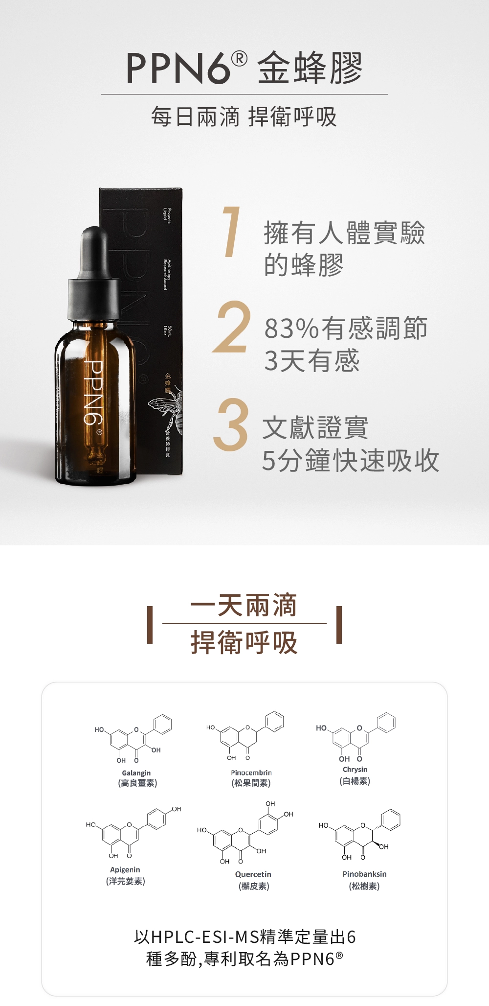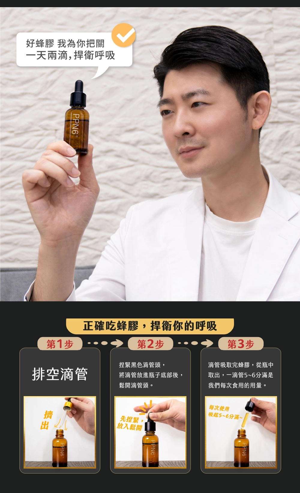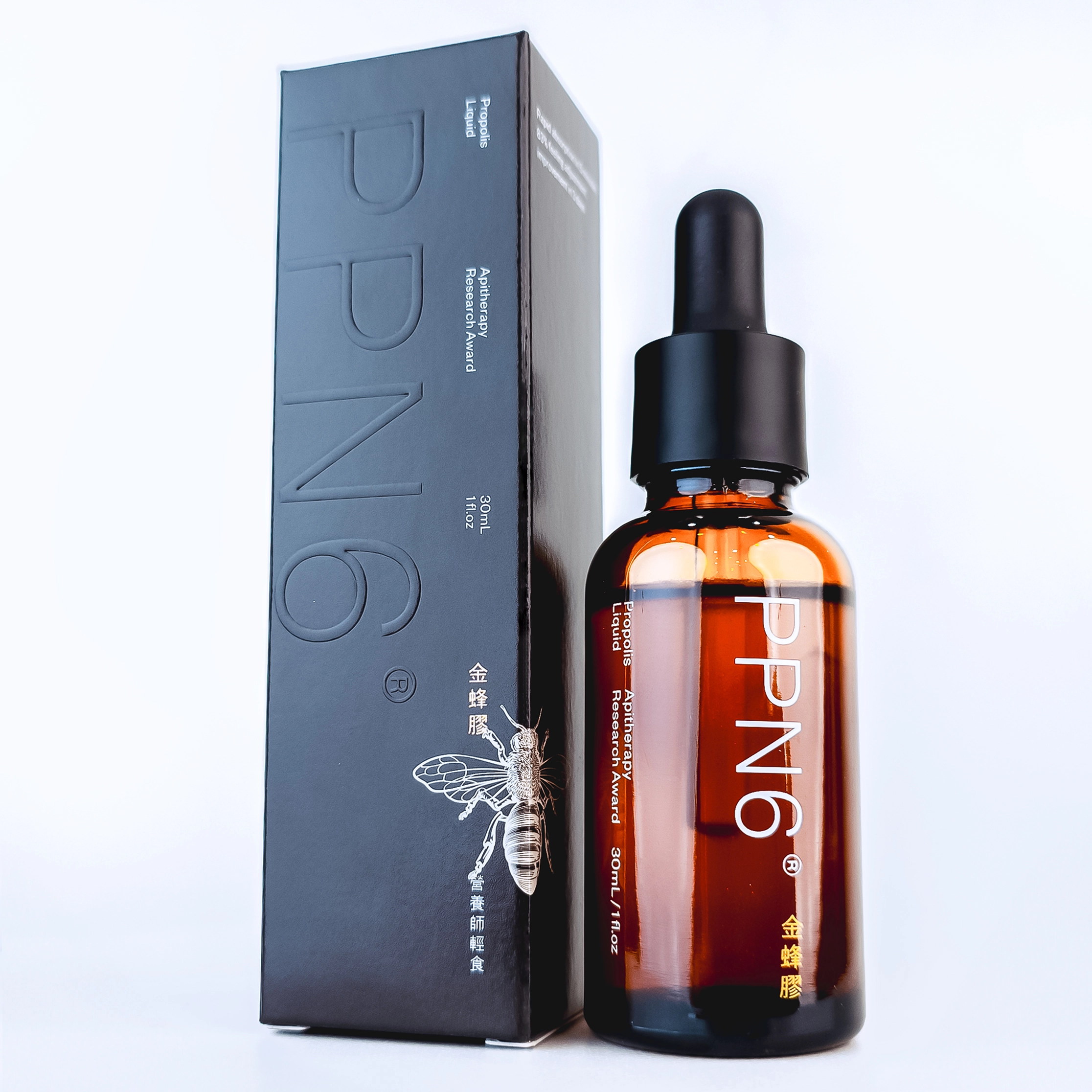PPN6金蜂膠來自米蘭40年歷史淬鍊的蜂膠,色澤呈現頂級琥珀金,無酒精、不刺激、不辣口,保證不含丙二醇及多環芳香烴,小孩可直接滴管使用,或者加入溫開水攪拌使用