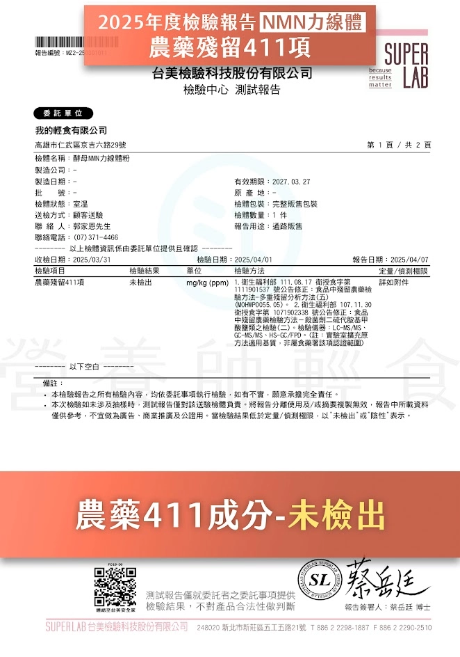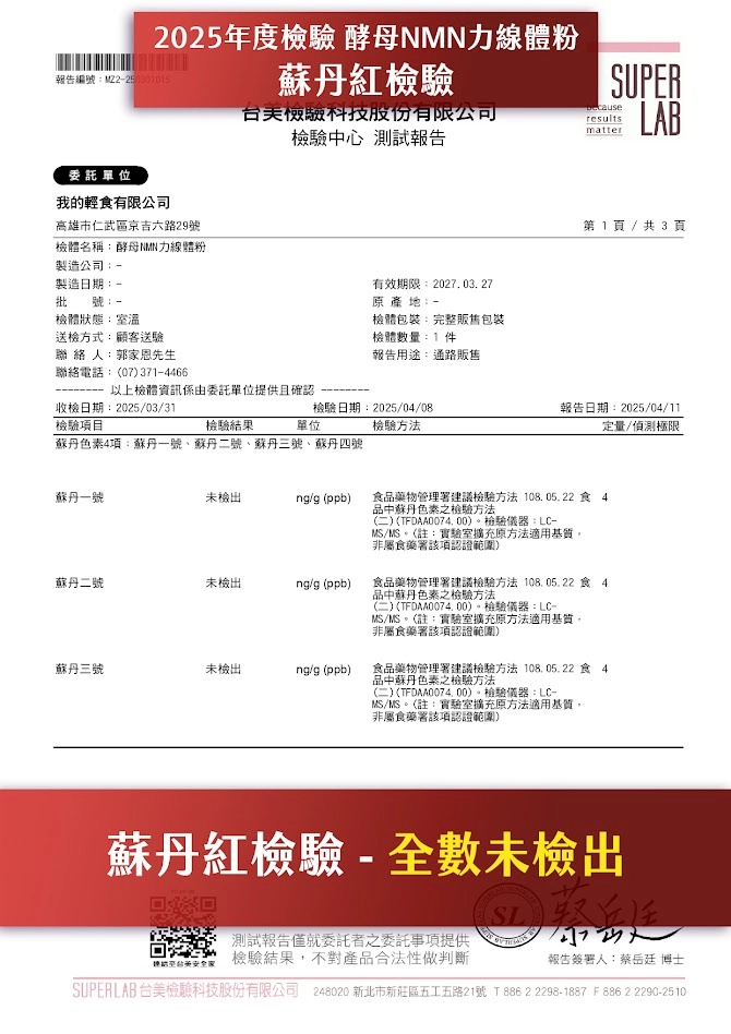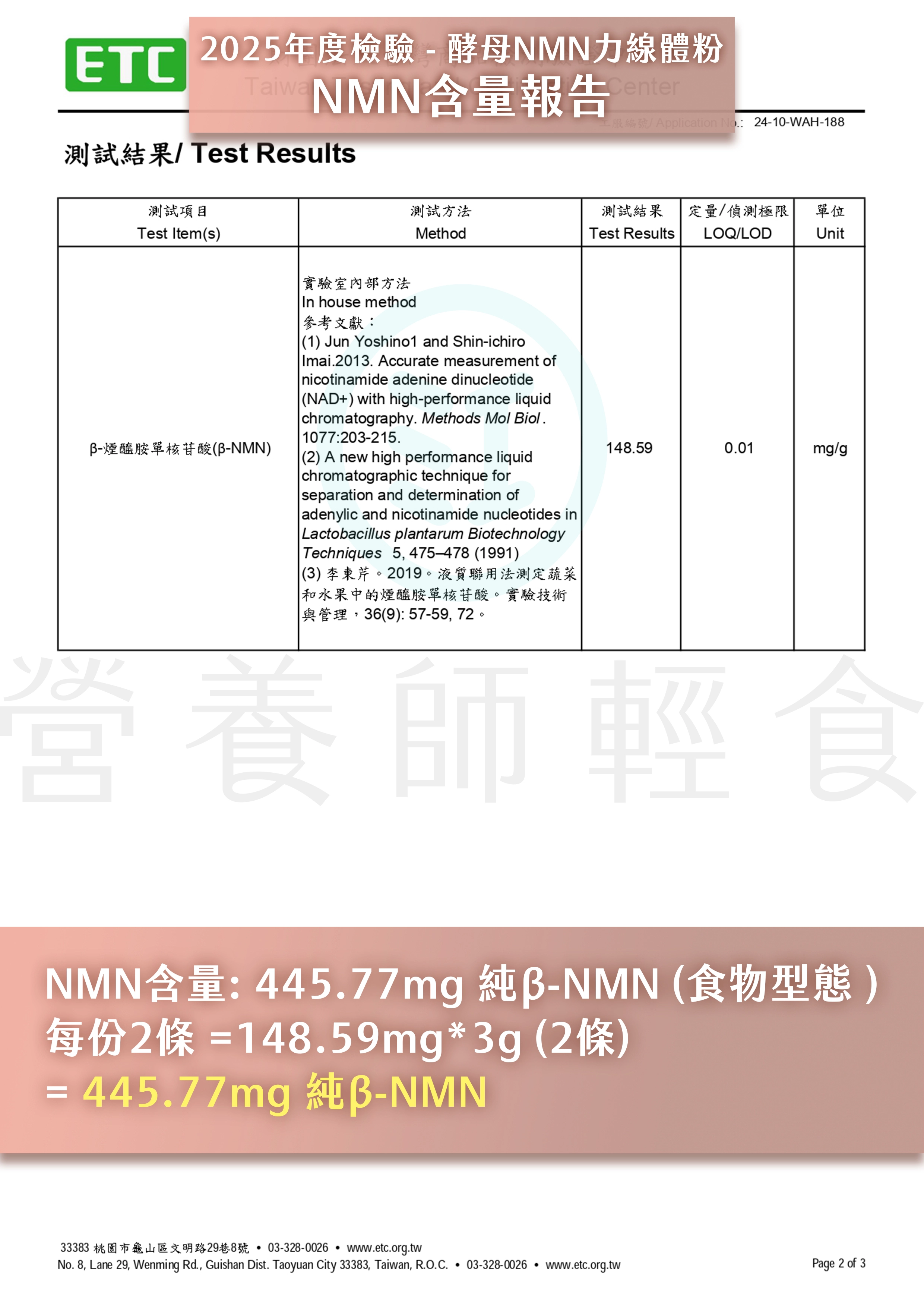 我們領先全台,以「食物型態」實現科學建議攝取量:300mg β-NMN。經第三方檢驗,【NMN 力線體】每份兩包實測含量高達 445mg,完全不玩虛標,是真正補充「有感」的 NMN,而非吃安慰劑!